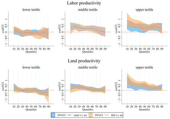 For land productivity, compared to no-mechanized farming, results displayed in the fourth and fifth columns of Table 5 show that semi- and full-mechanized farming significantly increase land productivity by 2.654% and 2.266%, respectively. The estimated quantile treatment effects indicate that lower-end farmers benefit much more in land productivity from semi- or full-mechanized farming than mid-level farmers. The difference (5.926%, 6.159%) is more than twice as much as those for the mid-level farmers (2.379%, 2.617%). An increase in land productivity is synonymous with more efficient farming practices with agricultural machinery, that is, if everything else is held equal. Based on the law of diminishing marginal productivity, the additional return generated by an upgrade in agricultural mechanization level declines the higher the land productivity is. One in particular is that, failing to reject hypotheses and joint hypotheses that state that semi- and full-mechanized farming bring the same treatment effects within and across means and quantiles, we cannot conclude that a higher level of mechanization has a larger improvement effect on land productivity. The result can also be observed in Figure 3. Though farmers are expected to benefit more from adopting a high level of mechanization, the finding suggests that no incremental effect of agricultural mechanization has been found on land productivity in our analysis.