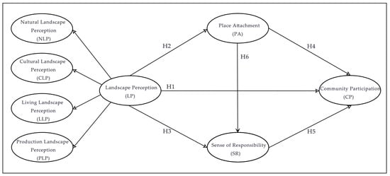 The existing research underscores the beneficial impact of PA on SR. Such a PA fosters a heightened SR among residents, thereby encouraging a more vigorous engagement in community activities [40]. Echoing this, further studies also corroborate the positive influence of PA on SR [41,42]. Additionally, a significant correlation was observed between tourists’ PA and their attitudes towards the conservation of tourism resources. A stronger PA leads to more favorable attitudes towards preserving these resources, coupled with an enhanced SR [43]. Consequently, it is evident that a higher degree of PA among community residents amplifies their SR towards their community. This insight holds substantial significance in the context of this study. Drawing on the Stimulus–Organism–Response (SOR) Theory model, the relationship between LP, PA, SR, and CP is mediated through both direct and indirect pathways. In this framework, LP signifies the residents’ perception of their community’s landscape environment. PA and SR represent emotional responses, aligning with the internal state of the “organism” in the SOR model. Meanwhile, CP is indicative of the residents’ behavioral responses. From the preceding discussion, it is evident that LP, PA, SR, and CP are interconnected. The relationship between these variables has not only direct effects but also indirect pathways. Therefore, the following hypothesis was developed: