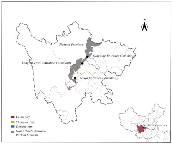 This study chose three of the earliest established communities in the Sichuan area of the Giant Panda National Park for empirical research: the Qingping Gateway Communities, Longchi Gateway Communities, and South Gateway Communities (Table 1). The Qingping Entrance Community is located in Qingping Town, Mianzhu City, Deyang City, Sichuan Province. It is situated in the middle of the Minshan area of Giant Panda National Park. As the first open giant panda entrance community in Deyang, it relies on tourism as its mainstay, with a well-developed infrastructure that has created a special Giant Panda Fairy Town. The community is rich in Qiang and Han cultures, and folklore activities are abundant. Furthermore, Longchi Town Entrance Community is situated in Longchi Town, Dujiangyan City, Chengdu, Sichuan Province. It serves as a key area connecting the two giant panda populations of Minshan and Qionglai. As an important entrance community in the Chengdu area, it is rich in natural resources and features a 4A-rated landscape with beautiful scenery. The community is predominantly inhabited by local residents, with simple customs and a deeply rooted giant panda culture. Related publicity and educational activities are frequently organized. Moving southward, the South Entrance Community is located in Longcanggou Town, Xingjing County, Ya’an City, Sichuan Province. It is the earliest entrance community established in the Sichuan area of the Giant Panda National Park, belonging to the Qionglai-Daxiangling area. Situated in the southernmost part of the designated area, it connects to several giant panda habitats, boasts superior ecology, thriving culture and tourism industries, and a strong giant panda cultural atmosphere. The three gateway communities, situated from north to south (Figure 2), boast an early onset of development and a relatively advanced level of maturity. Their varied landscape attributes, geographical traits, and indigenous cultures render them highly representative, thereby offering significant research opportunities and invaluable insights into ecological conservation and sustainable community development practices.
