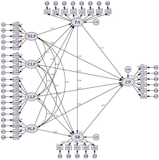 Table 5 and Figure 3 summarize the path coefficients of the hypothesized relationships among the constructs. Overall, the path coefficients of all four sub-dimensions of LP are statistically significant, using p < 0.05 as the criterion for significance in a hypothetical path analysis. The four sub-dimensions of LP, NLP, and PLP do not have a significant positive effect on CP (p > 0.05). However, CLP (β = 0.122, p < 0.05) LLP (β = 0.175, p < 0.05) show a significant positive impact on CP. The results indicate that all dimensions of LP significantly positively influence PA. NLP (β = 0.206, p < 0.05), CLP (β = 0.222, p < 0.05), and LLP (β = 0.214, p < 0.05) have significant positive effects on SR. SR (β = 0.184, p < 0.05) and PA (β = 0.184, p < 0.05) significantly positively affect CP, while PA (β = 0.167, p < 0.05) also has a significant positive impact on SR.