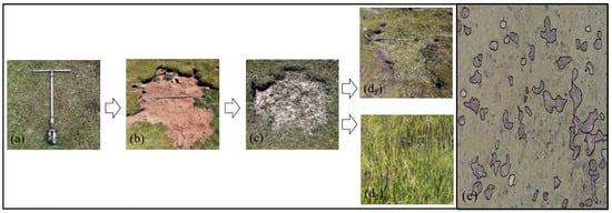 The study plot is in Henan Mongolian Autonomous County, Huangnan Prefecture, Qinghai Province (34°05′52″~34°56′36″ N, 100°53′06″~102°16′12″ E). The county’s altitude ranges from 3600 to 4200 m, with elevations higher in the northeast and lower in the southwest. The region primarily features four types of landforms: beaches, hills, low mountains, and high mountains. The climate is characterized by a plateau continental climate, with an annual average temperature of approximately 1.3~1.6 °C and annual precipitation ranging from 597.1 to 615.5 mm, mostly concentrated between May and October. The predominant vegetation type in this area is alpine meadows, dominated by Stipa species, and the main soil type is alpine meadow soil [25]. Due to the combined effects of overgrazing and rodent damage, numerous degraded bare soil patches have appeared in the alpine meadows of this region (Figure 1e) [25]. Basic vegetation information and soil physicochemical properties of the plot are presented in Table 1 and Table 2, respectively.
