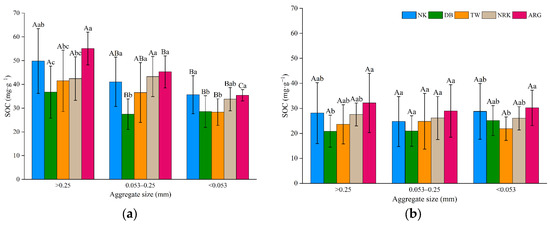 Soil Organic Carbon (SOC) content at different stages of degradation and restoration in alpine meadows. (a) SOC changes in the 0~10 cm layer; (b) SOC changes in the 10~20 cm layer. Different uppercase letters indicate significant differences between different aggregate size fractions within the same successional stage (p < 0.05). Different lowercase letters indicate significant differences within the same aggregate size fraction across different successional stages (p < 0.05). >0.25 mm: Macroaggregates; 0.053~0.25 mm: Microaggregates; <0.053 mm: Silt–clay fraction; NK: Natural Kobresia Patches; DB: Degraded Bare Patches; TW: Transitional Weed Patches; NRK: Naturally Restored Kobresia Patches; ARG: Artificially Restored Gramineae Patches.