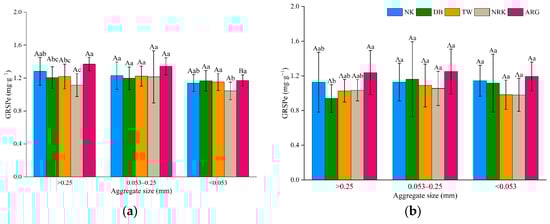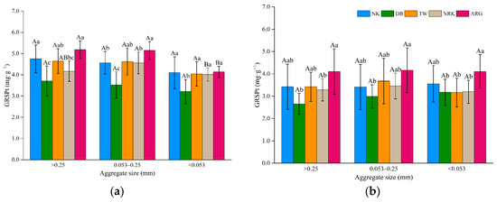 Across the 0~20 cm soil layers, the GRSPe and GRSPt contents in all aggregate fractions were higher in artificially restored Gramineae patches compared to naturally restored Kobresia patches. Although GRSPe content across aggregate fractions did not change significantly during the degradation and restoration succession (p > 0.05), in the 0~10 cm soil layer, the GRSPt content in macroaggregates in the artificially restored Gramineae patches was significantly higher than in silt–clay fractions (p < 0.05). Meanwhile, in naturally restored Kobresia patches, the GRSPt content in microaggregates in the 0~10 cm soil layer was significantly higher than in silt–clay fractions (p < 0.05).