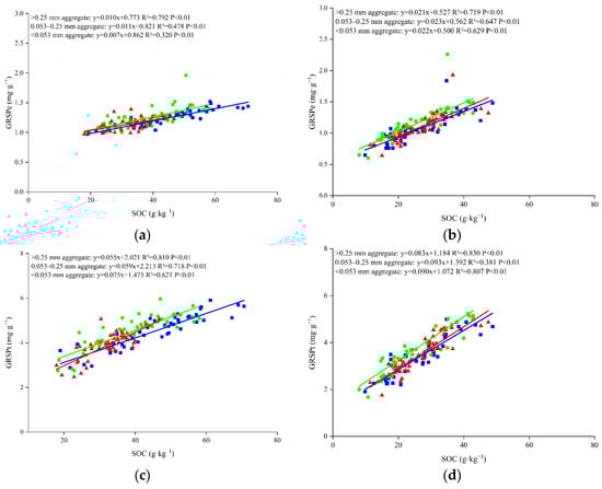 Linear regression analysis of SOC and GRSP in soil aggregates at different stages of degradation and restoration in alpine meadows. (a) GRSPe and SOC in the 0~10 cm layer; (b) GRSPe and SOC in the 10~20 cm layer; (c) GRSPt and SOC in the 0~10 cm layer; (d) GRSPt and SOC in the 10~20 cm layer.