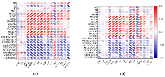 Correlation heatmap of environmental factors with aggregate fractions, their stability, SOC, GRSP, and associated ratios. (a) Correlations in the 0~10 cm soil layer; (b) Correlations in the 10~20 cm soil layer. MA: >0.25 mm aggregates; MI: 0.053~0.25 mm aggregates; SC: <0.053 mm aggregates; MWD: Mean Weight Diameter; MASOC: Macroaggregate SOC content; MISOC: Microaggregate SOC content; SCSOC: Silt–clay SOC content; MAGRSPe: Macroaggregate GRSPe content; MIGRSPe: Microaggregate GRSPe content; SCGRSPe: Silt–clay GRSPe content; MAGRSPt: Macroaggregate GRSPt content; MIGRSPt: Microaggregate GRSPt content; SCGRSPt: Silt–clay GRSPt content; RB: Root Biomass; TP: Total Phosphorus; TN: Total Nitrogen; PLFAs: Phospholipid Fatty Acids; SOC: Soil Organic Carbon. (*) indicates p < 0.05.