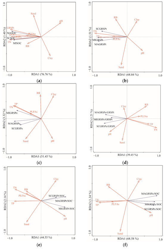 In the 0~10 cm soil layer, RDA indicated that TN had the highest explanatory power for aggregate SOC, GRSPt, GRSPe, GRSPe/GRSPt, and GRSPe/SOC, with explanatory rates of 67.7%, 63.0%, 35.3%, 33.1%, and 58.1%, respectively. TP had the highest explanatory power for the GRSPt/SOC ratio, at 29.2% (Figure 7). In the 10~20 cm soil layer, RDA showed that GRSPt had the highest explanatory power for SOC in different aggregate fractions, at 71.4% (Figure 7). PLFAs had the highest explanatory power for GRSPe, GRSPt, and GRSPe/GRSPt in different aggregate fractions, at 29.1%, 32.4%, and 9.5%, respectively, while pH had the highest explanatory power for GRSPe/SOC and GRSPt/SOC ratios in different aggregate fractions, at 13.1% (Figure 7).