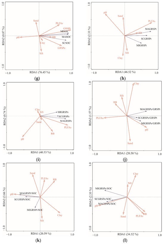 Redundancy analysis of environmental factors with aggregate fractions, their stability, SOC, GRSP, and associated ratios. (a) SOC in aggregate fractions with environmental factors (0~10 cm); (b) GRSPt in aggregate fractions with environmental factors (0~10 cm); (c) GRSPe in aggregate fractions with environmental factors (0~10 cm); (d) GRSPe/GRSPt ratio in aggregate fractions with environmental factors (0~10 cm); (e) GRSPt/SOC ratio in aggregate fractions with environmental factors (0~10 cm); (f) GRSPe/SOC ratio in aggregate fractions with environmental factors (0~10 cm); (g) SOC in aggregate fractions with environmental factors (10~20 cm); (h) GRSPt in aggregate fractions with environmental factors (10~20 cm); (i) GRSPe in aggregate fractions with environmental factors (10~20 cm); (j) GRSPe/GRSPt ratio in aggregate fractions with environmental factors (10~20 cm); (k) GRSPt/SOC ratio in aggregate fractions with environmental factors (10~20 cm); (l) GRSPe/SOC ratio in aggregate fractions with environmental factors (10~20 cm).
