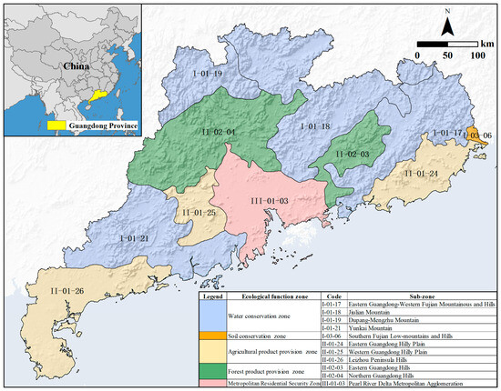 Guangdong Province is situated in southern China, with a total land area of 179,800 km2, bordered by Fujian to the east, Jiangxi and Guangxi to the west, Hunan to the north, Hong Kong and Macao to the south, and Hainan Province to the southwest. The terrain varies from high in the north to low in the south, featuring a diverse range of landforms, including plains and plateaus in the south and mountains and hills in the north. The Nanling Mountains in the north and the southern coastal zone play a crucial role in China’s ecological security strategy, known as the “two screens and three belts”. The province’s ecological environment is relatively fragile, susceptible to soil erosion caused by typhoons and heavy rains in hilly areas. The forest structure is simplistic, rendering the ecosystem fragile and vulnerable [36]. Guangdong Province is classified into different ecological function zones under “National Ecological Functional Zoning” [32], including the water conservation zone (WCZ), soil conservation zone (SCZ), agricultural products provision zone (APZ), forest product provision zone (FPZ), and metropolitan residential security zone (MRSZ) (Figure 1).