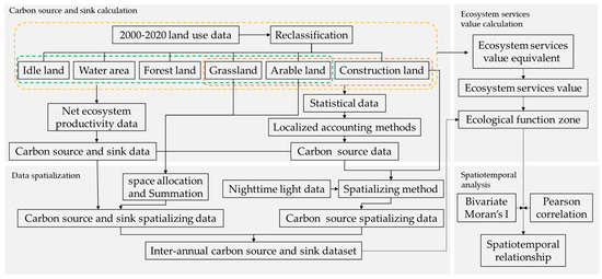 Last, based on Pearson correlation coefficients and bivariate Moran’s I, the study explored the temporal and spatial relationships between carbon emissions and the ecosystem service value. The specific process is illustrated in Figure 2.