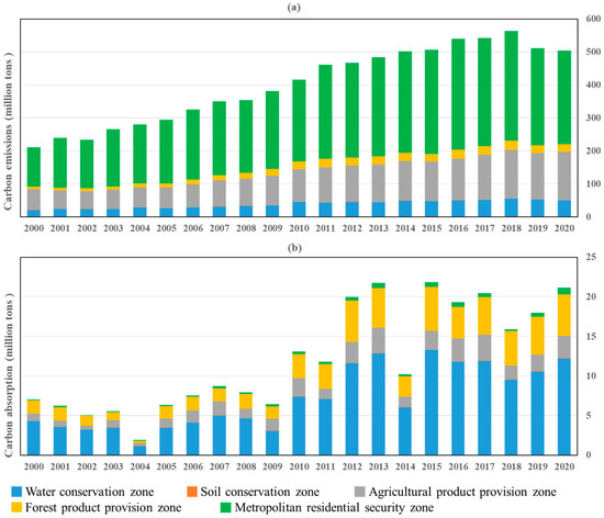 Carbon emissions (a) and carbon absorption (b) from 2000 to 2020 in each ecological function zone.