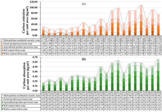 Per-unit area carbon emissions (a) and carbon absorption (b) from 2000 to 2020 in each ecological function zone.