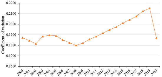 From the perspective of the coefficient of variation, the spatial differences in the ESV among the EFZs have gradually expanded (Figure 6). From 2000 to 2020, the coefficient of variation exhibited a general upward trend, indicating an increasing degree of spatial variation. Specifically, within the study area, the coefficient of variation first increased, then decreased, showing fluctuations from 2000 to 2008. Starting in 2008, it continued to rise until it experienced a slight decline in 2020.