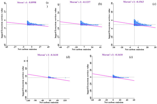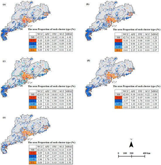 Bivariate Moran′s I in 2000 (a), 2005 (b), 2010 (c), 2015 (d), and 2020 (e).