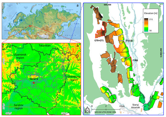 The location of the research object ((a)—the position of the Samara oblast within the Russian Federation; (b)—the position of the research object within the Samara oblast; the red marker shows the position of the regional center (Samara); (c)—agricultural lands of the AIC with the display of a digital elevation model; the boundaries of key sites are highlighted in red).
