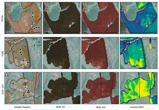The 1st column of images is the position of the soil survey points within key areas; the 2nd column is a synthetic composite image of the bare soil surface in natural colors (R = Band 3; G = Band 2; B = Band 1); the 3rd column is a synthetic composite image in artificial colors (R = Band 4; G = Band 3; B = Band 2); and the 4th column is the average annual vegetation index NDVI.