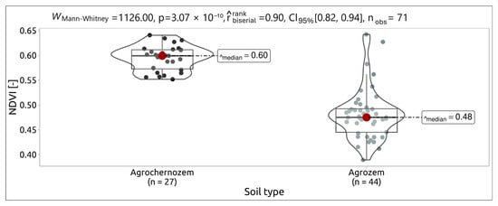 The areas of agrozems can be clearly identified on the basis of remote sensing data for the fields with bare soil surfaces, as well as for the fields under the canopy of cultivated crops (Figure 2), where crop failures occur. Thus, the values of the multitemporal vegetation index NDVI differ significantly for agrozems (0.48) and agrochernozems (0.60) at p < 0.01 (Mann–Whitney test) (Figure 3 and Figure 4a). Crop failures in agrozem areas are facilitated by a shortened soil profile, the presence of rubble, proximity of dense conglomerates (aquiclude), and increased dryness. With the high content of carbonates in the profile, conditions may arise that limit the availability of phosphorus compounds for cultivated plants due to the formation of insoluble calcium phosphate [], which will affect the development of plant root systems. Such soils are characterized by low soil loss tolerance; when these soils are located on slopes, erosion processes develop quickly. Therefore, these soils require increased attention during agroecological land assessment due to the high risk of their loss.