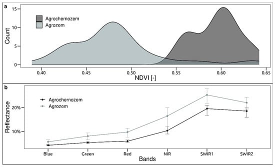 Noticeable differences are also observed in the remote sensing data for the bare soil surface. Figure 4b shows the average reflectivity spectra for two soil types, which were obtained by extracting the reflectivity values of six survey bands—types of characteristic spectral images—for each of the field soil survey points. The presence of calcium carbonates in the plow horizon, as well as the presence of carbonate gravel and stones on the surface, contributes to an increase in reflectivity in the entire range of the electromagnetic spectrum. The main differences also include a distinct absorption region in the short-wave infrared range (SWIR2) typical of the averaged spectra of agrozems and a plateau-like pattern of the averaged spectrum of agrochernozems in the SWIR1–SWIR2 range. The noticeable absorption band characteristic of the spectra of agrozems is due to deformation (fundamental) vibrations of carbonate ions () in the wavelength ranges of 2.30–2.35 and 2.50–2.55 μm [,,]. In addition, carbonates have several noticeable spectral absorption characteristics in the thermal infrared (TIR) range at 11.19–11.40 and 13.70–14.04 μm [,,]. However, the use of the thermal channel remains beyond the scope of this study due to its lower spatial resolution.