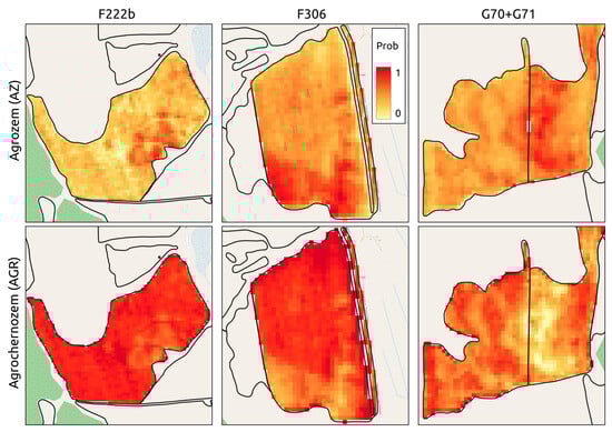 The use of the map of soil classes (types) in terms of threshold-limited probabilities can be considered simpler and more understandable. The expertly accepted threshold value of 80% provides a probabilistic estimate of the limit, beyond which the presence of a particular soil class was assumed. Figure 7 shows soil maps for the three key areas under study. In addition to the agrochernozem areas (class 1) and agrozem areas (class 3), the maps highlight areas where the soil probabilities do not exceed the threshold value and are in the range of 40 to 60%. Such areas can be considered from the standpoint of the concept of soil cover patterns [], from a similar concept of soil landscapes [], or from a concept of pedodiversity [,]. According to the theory of soil cover patterns developed by V.M. Fridland, such areas may be considered as alternating in space mosaic combinations of the areas of dark-humus agrozems (Calcaric Phaeozems) or black-humus agrozems (Calcaric Phaeozems or Calcaric Chernic Phaeozems) developed from multilayered parent materials and clay-illuvial agrochernozems (Luvic Phaeozems, Luvic Chernic Phaeozems, or Luvic Chernozems) developed from the more homogeneous carbonate loamy parent material. Areas of agrozems within such topolithomosaics do not have a clear association with particular elements of topography and form contours of both isomorphic and more complex configurations.