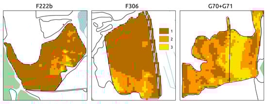 Field studies were conducted in July and October 2023. Four representative key plots on the AIC agricultural land were selected as test sites: F222b (128.8 ha), F306 (87.5 ha) and G70 + G71 (159.8 ha). Soil sampling points (71 pits) were laid within the test plots (Figure 2). During the field survey, guidelines for the morphological description of soils were used, and soil names were given according to the classification system of Russian soils [] and the WRB system []. The identification of soil was based on the diagnostic criteria accepted in these classification systems, taken separately.