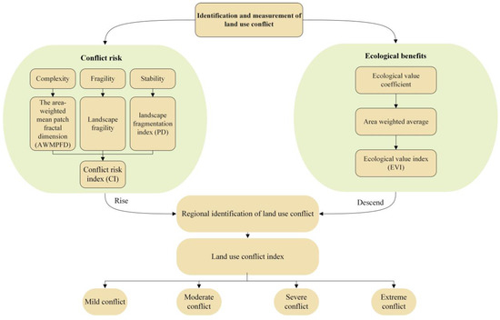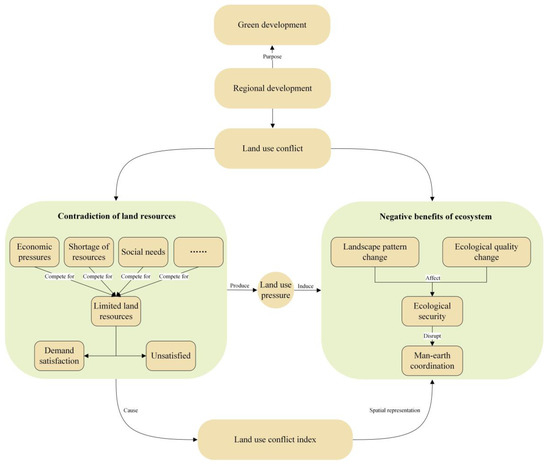 Therefore, to compensate for the shortcomings of the current research on LUCs, this paper aims to (1) explore the connotation of LUCs from the perspective of the ecological and comprehensively analyze the landscape pattern and ecological environment changes caused by land use/cover change (LUCC); (2) construct a conflict identification and measurement method based on the ‘conflict risk–ecological value’ through the ‘conflict risk index’ and ‘ecological environment value index’; and (3) simulate the spatial distribution and intensity of LUCs in the future to explore possible scenarios that can effectively alleviate LUCs in the future development process in combination with regional policies to propose targeted countermeasures to alleviate conflicts. This study constructs a framework for alleviating LUCs from an ecological perspective and provides a comprehensive discussion of LUCs, including the concept, implications, measurement methods, and potential solutions. The proposed framework aims to enhance the research system on LUCs, enrich its conceptual and measurement approaches, and provide the basis for regional coordinated development decision-making.