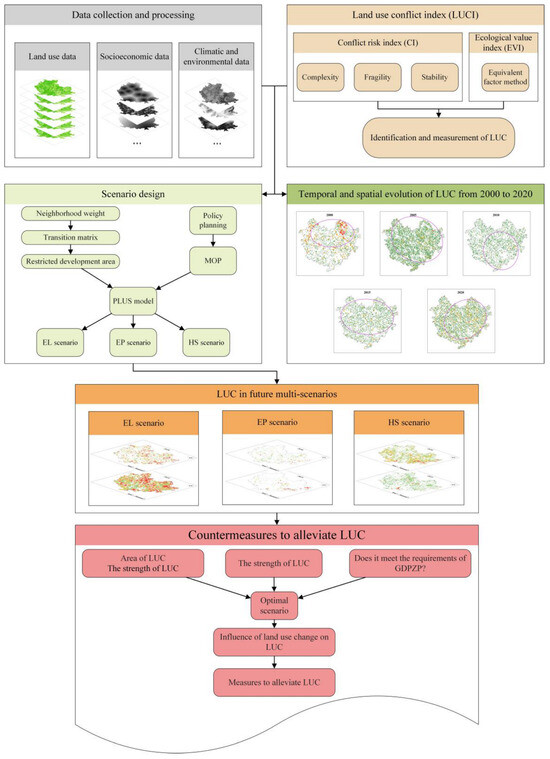 With the acceleration of regional development, the ecological problems caused by LUCs are becoming increasingly severe. To address this issue effectively, it is of utmost importance to devise a scientific methodology for the identification and assessment of LUCs. Therefore, from an ecological perspective, we constructed a framework aimed at mitigating future LUCs. This framework explores LUCs from the aspects of concept, connotation, LUC measurement and future scenario simulation. In this research, we employed the ‘conflict risk–ecological value’ method to identify and quantify areas of LUC and their intensity during the process of regional development. The PLUS model is integrated with the MOP approach to forecast potential future development scenarios, and the ‘optimal scenario’ is selected using LUCI. On the basis of these analyses, we draw the following conclusions: