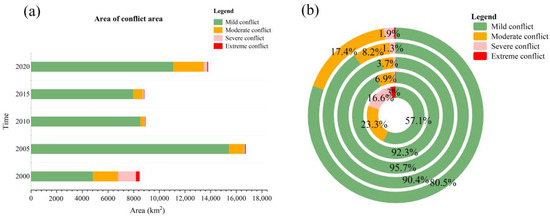 (a) Areas of different conflict levels from 2000 to 2020. (b) Proportion of different conflict levels to total conflict area from 2000 to 2020 (the innermost level is 2000, the outermost level is 2020, and the percentage label of conflict level with less than 1% is hidden).