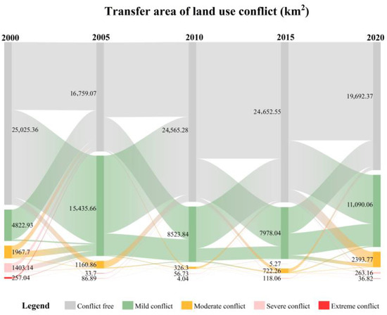 We calculated the CI and EVI from 1995 to 2020 using Formulas (3) and (7) to obtain the LUCI using Formula (2) and divide it into four grades via the natural discontinuity method (mild conflict: 0~0.12, moderate conflict: 0.12~0.68, severe conflict: 0.68~1.89, extreme conflict: >1.89). Figure 5 shows the areas of different levels of LUCs and the transfer between different levels of LUCs from 2000 to 2020. In summary, mild conflicts in each year comprised over half of the total conflict zone area, constituting the predominant LUCs in Hechi city, with the conflict situation relatively tempered. The changes in LUCs’ area in 2005, 2010, 2015 and 2020 were increase, decrease, increase, and increase, respectively. Among them, the most substantial growth was observed from 2000 to 2005, with a substantial growth of 8266.29 km2 and a remarkable increase of 97.82% in the rate. Although mild conflict has remained the dominant position, the extent of LUCs has been increasing annually since 2010. In addition, moderate conflicts, severe conflicts, and extreme conflicts have also been increasing each year. Over the past ten years, the areas of the three conflicts increased by 633.62%, 363.90%, and 811.02%, respectively. During this decade, although the area of extreme conflicts has grown relatively small, the growth rate was very high, increasing by eight times, and the spread rate was also very fast. The land-use conflict transfer map (Figure 6) illustrates the mutual evolution characteristics of different levels of LUC. Specifically, ‘no conflict’ denotes areas without any LUCs. The LUCs in Hechi city exhibited both increasing and decreasing trends. On the whole, changes are mainly conversion between no conflict and mild conflict. Among them, the most significant change occurred from 2000 to 2010, with 13,483.65 km2 of conflict-free areas converted to mild conflict. In addition, areas that changed from mild conflict to conflict-free areas represent a total of 11,978.16 km2. In the time period when the higher conflict level is transformed into no conflict, the largest transformation occurred from 2005 to 2010, and a total area of 1013.91 km2 of moderate conflict was transformed into no conflict. In the period when no conflict rose to a higher conflict level, the largest conversion occurred from 2015 to 2020, and a total area of 1811.24 km2 of no conflict was converted into moderate conflict.