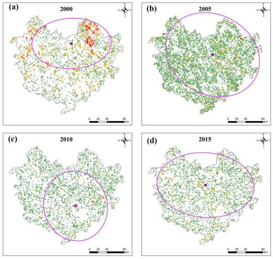In 2005, the LUC pattern changed significantly. On the whole, the conflict area increased, and the high-level conflict area decreased. The overall distribution is scattered. The standard deviation ellipse effectively captures and represents the spatial distribution characteristics of spatial elements. In 2005, the LUC distribution ellipse exhibited the following changes: the center of the ellipse moved southeast (Figure 7f), the ellipse area increased by 15,674.23 km2, the minor axis increased by 33.69 km, and the oblateness decreased from 0.36 to 0.18 (Table 2). According to the changes in the above indicators, the spatial pattern characteristics of LUC from 2000 to 2005 mainly exhibited the following changes: (1) LUCs generally moved to the southeast. The area and intensity of the conflict in the southeastern region increased greatly, which had a greater pulling effect on the eastward movement of the ellipse. (2) LUCs exhibited a more dispersed spatial distribution.