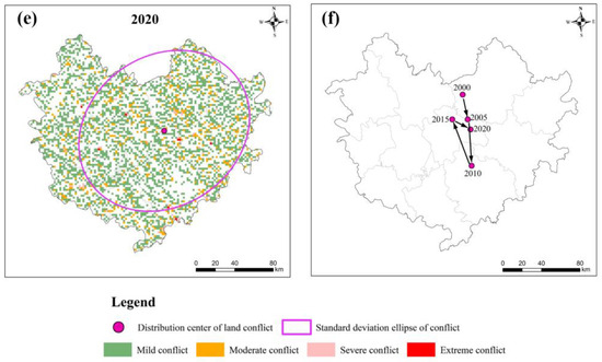 (a–e) Spatial distribution of LUC from 2000 to 2020. (f) The shift of ellipse center of LUC distribution.