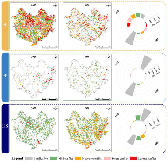 By combining the PLUS model with multi-objective programming, the LUC patterns for 2025 and 2030 were simulated (Figure 8). In the various simulation scenarios for 2025, the conflict areas exhibit notable variations in both spatial distribution and quantity. The scenario with the largest conflict area is predicted to be EL, followed by HS and then EP, with areas measuring 26,745.16 km2, 10,426.33 km2, and 1804.24 km2, respectively. These areas account for 79.89%, 31.15%, and 5.39% of the total area, respectively. In the EL, EP, and HS scenarios, mild conflicts constitute the predominant type, accounting for 28.49%, 36.45%, and 84.51% of the total conflict area, respectively. Among the three scenarios, the EL scenario has the largest areas of severe and extreme conflicts because of the expansion of built-up land and cropland. The combined area of these two conflict levels is predicted to total 12,245.99 km2, comprising 36.58% of the region’s total area. This is followed by EP, with an area of 726.87 km2, accounting for 2.17%, and HS, with the smallest area of 564.14 km2, accounting for 1.69%. These results also indicate that the extensive expansion of cultivated and built-up land, coupled with fragmentation of these lands, not only complicates spatial dynamics and system vulnerability but also diminishes the overall stability of regional land use. The aforementioned changes will inevitably result in the escalation of LUCs, posing more significant challenges to the region’s ecological environment and socioeconomic development [24].