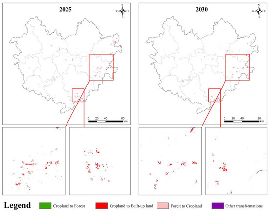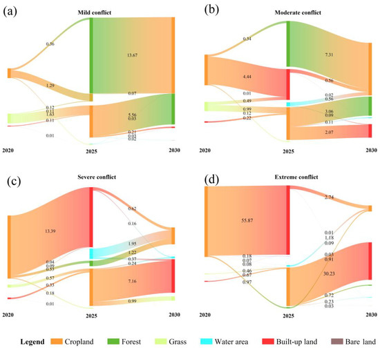 For severe land-use conflicts, analysis reveals that ‘cropland–built-up land’ will always be the dominant land-use change type in severe conflict areas, but its change area will show a significant downward trend from 13.39 km2 in 2020–2025 to 7.16 km2 in 2025–2030. It is noteworthy that the conversion of water to cultivated land will become a secondary land use type in severe conflict areas from 2025 to 2030, and this type of transformation will have a significant effect on the generation of extreme conflict areas, highlighting the importance of water protection. The major LUCC types in mild and moderate conflict areas will mainly include the mutual transformation among cropland, forest, and grass.