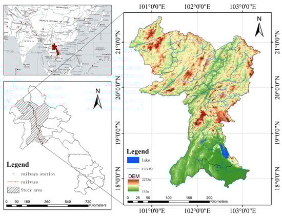 This study employs the Laos part of the Greater Mekong Sub-region (GMS) North–South Economic Corridor (NSEC) as a case study, including the administrative areas of the Luang Namtha Province, Oudomxay Province, Luang Prabang Province, Vientiane Province, and Vientiane Capital, geographically located between 17°46′ N and 21°36′ N and 100°35′ E and 103°23′ E (Figure 1). Among these, the Vientiane Province experienced administrative changes with the dissolution of the Xaisomboun Saysettha Special Zone and its conversion into a province. This study adopts the 2015 adjusted administrative boundaries as the study area’s border.