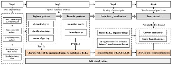 The research framework mainly includes four steps (Figure 2): (1) Data organization: Based on high-quality time-series LUCC maps from Globelland30, a multi-source spatial dataset was created by performing kernel density estimations, shortest paths, and inverse distance weighting interpolation calculations based on the raw data. (2) Spatial statistical analysis: Using LULC map samples, land use dynamics, land use transition matrices, land use change intensity, land use degree, and spatial centroid were calculated to analyze the spatio-temporal evolution characteristics of land use. (3) Driving effect analysis: The RFC algorithm was used to detect LUCC driving factors, assessing the contribution of natural resource data and socio-economic data on land use expansion (cultivated land, forestland, grassland, and artificial surfaces). (4) Based on the results of the analysis of the spatial and temporal evolution characteristics of land use and the driving mechanism, spatial intervention policy conditions are set up, and a multi-scenario simulation prediction is carried out using the CA-Markov model.
