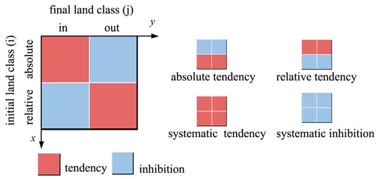 By comparing the trends between a land class’s inflow (or outflow) intensity and the average inflow (or outflow) intensity, the tendency or suppression of that land class’s conversion process can be identified. For example, if = , it implies that the transfer of land class n from each land class is uniform and less influenced by the land use and cover structure of the study area. If > , it suggests that land class n gains more inflow from land class iii than the average level, indicating a tendency for inflow from land class i (red legend). Conversely, if , it means that the inflow from land class i into land class n is below the average level, indicating suppression of inflow from land class i (blue legend). By dividing the map into units through a Confusion Table of land use transitions, an intensity map (Figure 3) is generated, showcasing the stability and systematic characteristics of the land use change process.