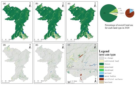 LUCC of Land Cover Evolution in the Study Area from 2000 to 2020. (a–c) represent land cover in 2000, 2010, and 2020; (d,e) represent changes in land cover types from 2000 to 2010 and 2010 to 2020; (f,g) depict the concentrated construction areas in Luang Prabang and Vientiane from 2000 to 2010.