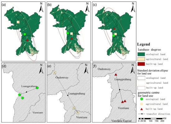 (a–c) show the degree and geometric center of land use in 2000, 2010 and 2020; (d–f) show the geometric center shift paths for ecological land, agricultural land and built-up land, respectively, in 2000–2020.