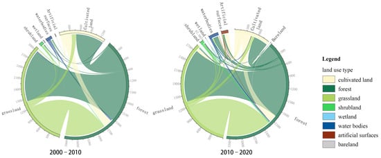 In terms of land use transition direction and intensity, intensity maps were used to connect transition directions with time phases, reflecting variations in transition intensity among different land types. Figure 7a shows the LUCC intensity map for the study area from 2000 to 2010. Cultivated land exhibited an absolute tendency for conversion to forest, with a relative tendency for conversion to water bodies, while showing systematic inhibition for conversion to shrubs and bare land. Forest-to-cultivated-land transitions were absolutely inclined, with a systematic tendency toward grassland. Grassland and cultivated land exhibited relative inclination, while wetland-to-cultivated-land transitions showed relative inclination. Water bodies showed a relative inclination towards conversion to shrubs and artificial surfaces, while artificial surfaces exhibited a relative inclination towards water bodies. Shrubs and bare land predominantly exhibited systematic inhibition. Figure 7b illustrates the LUCC intensity map from 2010 to 2020, with cultivated land and artificial surfaces showing systematic tendencies. Forest-to-cultivated-land transitions remained absolutely inclined, with forest-to-grassland conversions also systematically inclined. Grassland-to-artificial surfaces showed a relative inclination, while shrubs, wetlands, and bare land continued to demonstrate inhibited transformation characteristics.