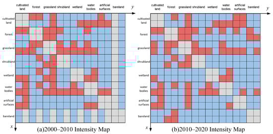 Intensity map of land cover change, (a) 2000–2010; (b) 2010–2020.