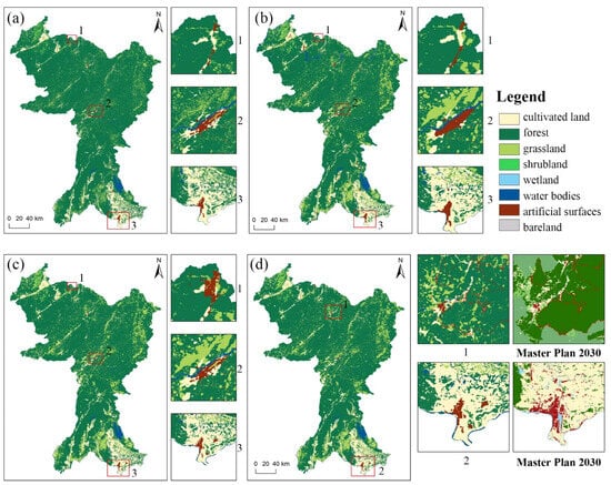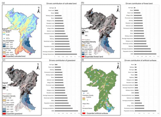 (a–d) show the drivers and contributions of changes in cultivated land, forestland, grassland and artificial surfaces in the study area.