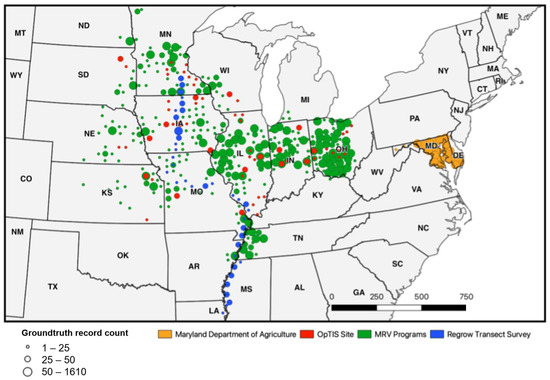 Data from the Maryland Department of Agriculture included field centroids, termination dates, and methods for enrolled cover and non-cover crop fields (2015–2021). Internal MRV programs provided crop type, cover crop, tillage, planting, and harvest information primarily for the Corn Belt (2017–2021). OpTIS site data, collected through roadside observations, included multiple surveys per field per growing season with crop type, tillage practices, cover crop adoption, vegetation cover, residue, soil conditions, field boundaries, and photos (2017–2023). Finally, the Regrow Transect survey contained ground-truth data on green cover, tillage, and crop type from roadside observations (2022). The spatial distribution of ground-truth data are heavily concentrated in the US Corn Belt, with a large representation in Maryland and smaller distributions in Tennessee, Arkansas, and Mississippi (Figure 1).