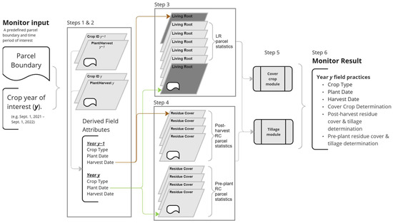 Regrow’s Monitor 2.0 is a geospatial software and analysis system that aims to capture and report the complete sequence of agricultural practices over any agricultural field across a single year or sequence of multiple years. Monitor reads, analyzes, and interprets the rasters, calculates field-scale statistics, and translates those observations of crop identification, plant and harvest dates, and biophysical attributes into a series of agricultural practices (Figure 2). For example, for each field boundary identified by the parcel delineation method (Section 2.4) and each crop year in the time series (2014–2023), Monitor calculates and implements zonal statistics for the field using the gridded geospatial rasters of cropID (Section 2.5), living root (Section 2.6), residue cover (Section 2.7), and Plant-Harvest (Section 2.8). Monitor identifies the crop type using the mode of the predicted crop type values for the field; the plant and harvest dates of that crop using the mode of the plant and harvest dates for the field; the presence of a cover crop during the non-commodity crop season using the field scale mean living root values for each month of that period; and categorical tillage intensity using the field scale mean residue cover values from a period following the harvest of the crop identified and prior to the planting of the following crop. The system tracks this sequence of events and their degree of mutual exclusivity, as well as spatiotemporal climatic constraints on vegetation growth. Monitor considers an agricultural cycle (or crop year) as post-harvest to harvest; the year of harvest represents the crop year (y). Figure 2 provides a schematic of Monitor (detailing the steps listed below) where for any crop parcel boundary and crop year (y), Monitor:
