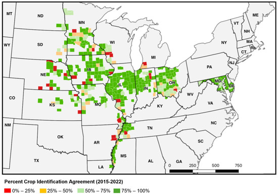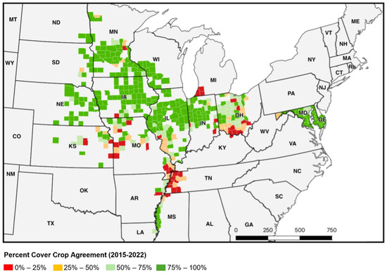 Remote sensing data offer a robust technique for monitoring and mapping the adoption of conservation focused agriculture practices at the landscape scale. Previous studies have established the utility of these data to track regenerative practices, but with adoption rates that vary by region and study. Zhou et al. [10] found an increase in cover crop adoption rates from 1.8% to 7.2% from 2000 to 2021 in the Midwestern United States using a scalable remote sensing framework while Ahmed et al. [11], using a remote sensing framework and a Random Forest algorithm, tracked a 34% increase in cover crop adoption from 2013 to 2019 in the Mississippi Alluvial Plain. A regionally smaller study over the Maumee River watershed [12], also using remote sensing data and a Random Forest model, found no apparent increase in cover crop area from 2008 to 2019. Conservation tillage has also been monitored with remotely sensed data by inferring tillage intensity from residue cover estimates or using models trained on field-level observations. Azzari et al. [13] implemented remotely sensed data and a Random Forest model to classify tillage intensity across the north central US region from 2005 to 2016. The study displayed accuracies spanning 75–79% overall, crop type specific tillage accuracies spanning 60–80%, and comparisons to 2006 USDA survey data displaying an R2 of 0.55. A smaller scale effort over smallholder systems [14] displayed tillage intensity accuracies of 62% using Sentinel-2 data. Residue estimation (used as a proxy to estimate tillage intensity) have displayed high correlations between percent residue cover and spectral indices when high-resolution or narrow bandwidth data are available. For example, Eskandari et al. [15] displayed r2 values ranging from 0.74 to 0.90 over wheat residue fields that ranged from 0 to 80% cover and Yue et al. [16] displayed consistent correlation coefficients above 0.75 across a range of spectral and band angle indices. The application of coarser spatial and spectral satellite imagery to estimate residue cover has achieved similar success [17,18,19,20,21], but many studies highlight the difficulty in properly accounting for soil conditions, soil moisture, and residue moisture content [18,19]. Remote sensing derived crop type data and related studies that enable estimating crop rotation are prevalent in some geographies such as the U.S., Canada, and Brazil [22,23,24] with accuracy rates of 70 to 85%. Multiple studies and new methods are continually explored to improve these results and incorporate alternative remote sensing methods and data sources [25,26,27,28]. While the numerous studies highlighted above (and many others) have successfully employed remote sensing to monitor individual regenerative practices, there are few examples of aligning the practices sequentially to compile a complete temporal history of the field, particularly at scale across vast geographies and the millions of fields that comprise global supply chains.