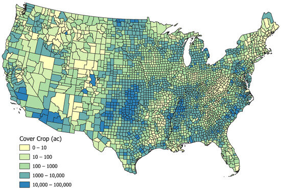 Cover crop determinations for the over 9.3 million fields are summarized by county for the 2014–2023 time period. (Figure 4). Both cover crop and potential cover crop area are included. The quantity of agriculture land varies by orders of magnitude across counties, so results are displayed on a logarithmic scale.