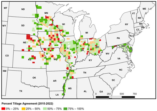 There is significant variation in tillage agreement across CONUS (Figure 7). Mississippi and Maryland exhibit the highest consistency in tillage practice agreement; however, the remaining states display counties that span the full range of categorical agreement in tillage-practice determination. With nearly three-quarters of the dataset originating from just three states (Table 1, Figure 1), this overrepresentation of certain regions limits extrapolation to other areas. Furthermore, the reliance on farmer-reported data from the MRV program could introduce uncertainty, as intended practices may not always align with implemented practices and the ultimate field conditions. Fritz et al. [56] have highlighted the discrepancies between survey-based and remote sensing data. The OpTIS and Regrow Transect survey datasets, while smaller, provided additional data points but were insufficient to balance the overall spatial distribution. The heterogeneous distribution of data across CONUS, coupled with variations in data density and availability across different years, further compounded these issues. These limitations underscore the need for more comprehensive, spatially balanced, and temporally consistent datasets to enhance the accuracy and reliability of future assessments.