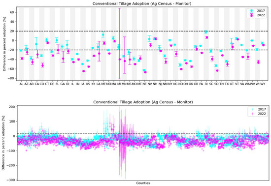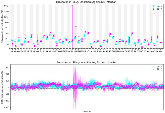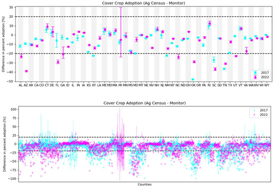 Difference between the Ag Census cover crop adoption percentage and the Monitor cover crop adoption percentage, for years 2017 and 2022, by state (top) and county (bottom). Uncertainty bars are the 5th–95th percentile interval as derived from bootstrapping the reported confidence values in the Ag Census data for cover crop acreage and total agricultural land acreage.