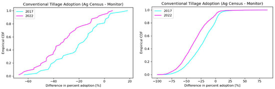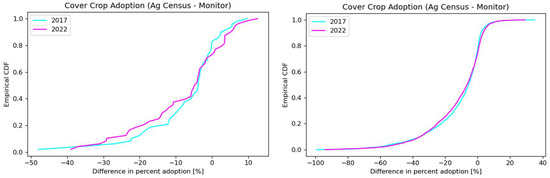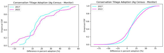 Monitor cover crop estimates align well with practice adoption rates reported by the Ag Census. Differences by state and county are plotted in Figure 6 and display a high rate of agreement despite the difference in methodology. Cumulative distribution functions of the medians of the differences between Monitor and Ag Census cover crop rates demonstrate that 90% and 81% of states (Figure 8 top, Figure 9 left), and 77% and 74% of counties (Figure 8 bottom, Figure 9 right), for years 2017 and 2022, respectively, are within 20% of the Ag Census estimated percentage adoption (tabular data provided in Table S3 in Supplementary Materials).