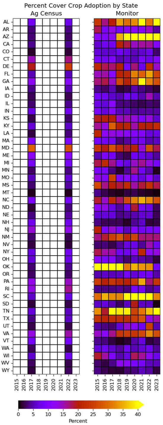 The two years of Ag Census data (2017, 2022) provide a coarse estimate of change in state-level cover crop planting rates over the period of this study. However, when comparing those two years all states displayed a 1% or less annual rate of change in cover crop planting, making it difficult to draw meaningful conclusions or develop plans or incentives to increase practice adoption. In contrast, Monitor provides annual data for the period and highlights the inter-annual variability in realized cover crop (Figure 10). Tracking the year to year conditions and variability is critical to estimating the outcomes of regenerative practices and allows further analysis on attribution of cover crop adoption rates to programs and incentives, including the impact of inter-annual weather and climate on realized cover crops at regional and continental scales.