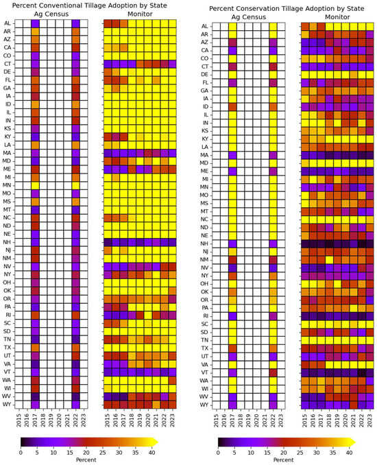 The following supporting information can be downloaded at: https://www.mdpi.com/article/10.3390/land13122246/s1, Table S1. Confusion matrix illustrating the performance of the Monitor system in classifying row crops. Rows represent Monitor determinations, while columns indicate ground-truth data. Overall Accuracy is 80%. Table S2. Confusion matrix in determining tillage practices, inclusive of Conventional Till, No Till and Reduced Till. Table S3. Percentage of states and counties where the Monitor percentage adoption of cover crop and tillage practices fall within +/− 20% of the USDA-NASS estimated percentage adoption of the same practice.