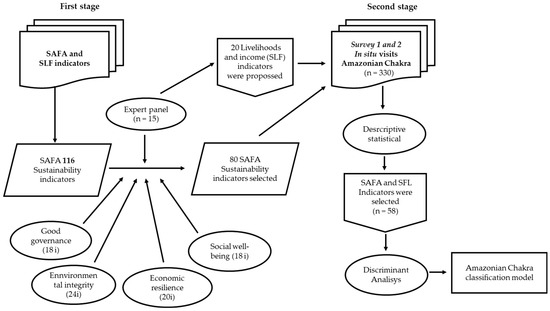To achieve the proposed objectives, a two-stage qualitative and quantitative mixed methodology was used (Figure 3). In the first stage, the relevant index in the Amazonian Chakra system was selected. This stage began with 116 indicators of the SAFA methodology, 15 livelihood indicators, and 5 income indicators of the Chakra (Supplementary Material Tables S1 and S2). The indicators were evaluated and grouped into dimensions based on the bibliography and by Delphi method with a panel of experts (n = 15). Subsequently, indicators were grouped into dimensions to deepen the knowledge of their relationships and the incidence on obtained variability.