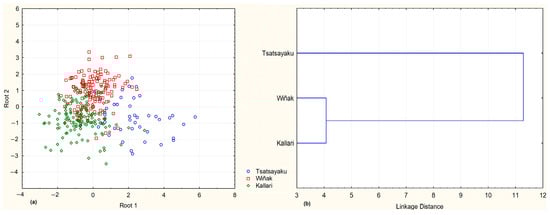 Figure 4. Plot of the discriminant scores of individual observations obtained with the canonical discriminant function (a) and cluster analysis from Mahalanobis distances (b) for the producers of the three associations studied.